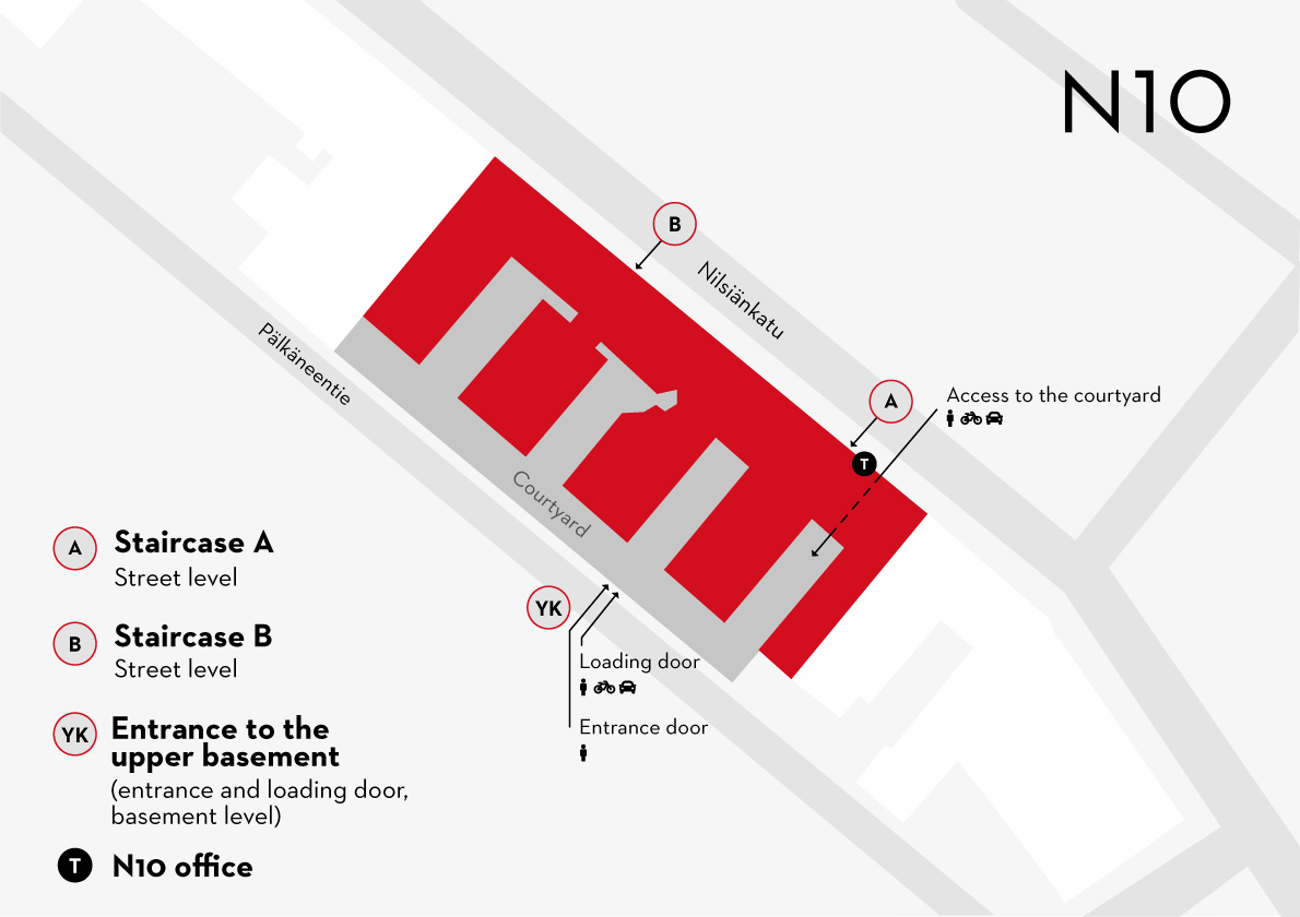 There is direct vehicle access from Nilsiänkatu to the N10 courtyard, and from Pälkäneentie to the loading and storage facilities.